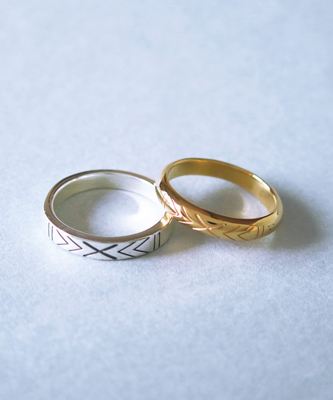 同デザインで平リングのシルバーカラー、甲丸リングのゴールドカラー(K18YGプレーティング)をご用意しております。